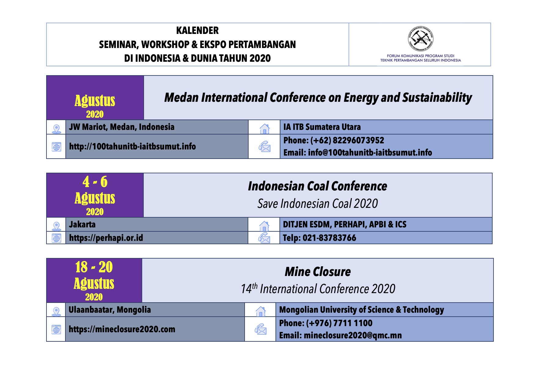 Agenda Seminar Bulan Agustus 2020 01/08/2020 08:00 - 31/08/2020 17:00 Beberapa kegiatan Nasional dan Internasional di Bulan Agustus 2020