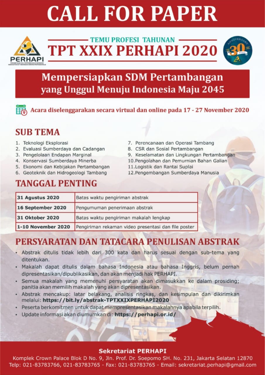PERHAPI Mengadakan Temu Profesi Tahunan (TPT) XXIX 2020 dengan tema: Mempersiapkan SDM Pertambangan Unggul menuju Indonesia 2045. Penyelenggaraan tahun ini, akan dilakukan secara on-line/daring.