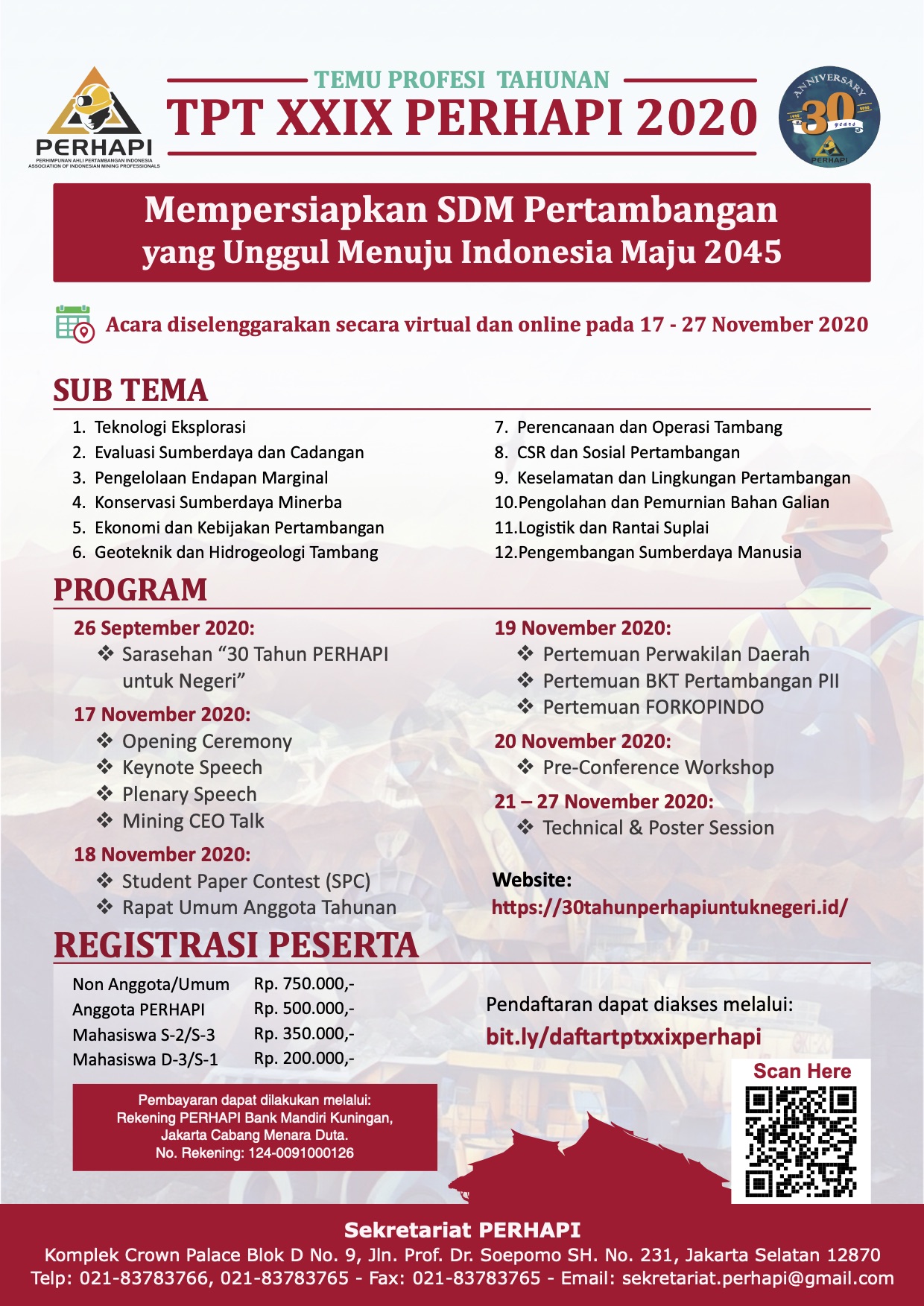 Pendaftaran TPT XXIX PERHAPI 2020 17/11/2020 09:00 - 27/11/2020 17:00 Pendaftaran Peserta TPT XXIX PERHAPI 2020 sudah bisa dilakukan melalui link: bit.ly/daftartptxxixperhapi