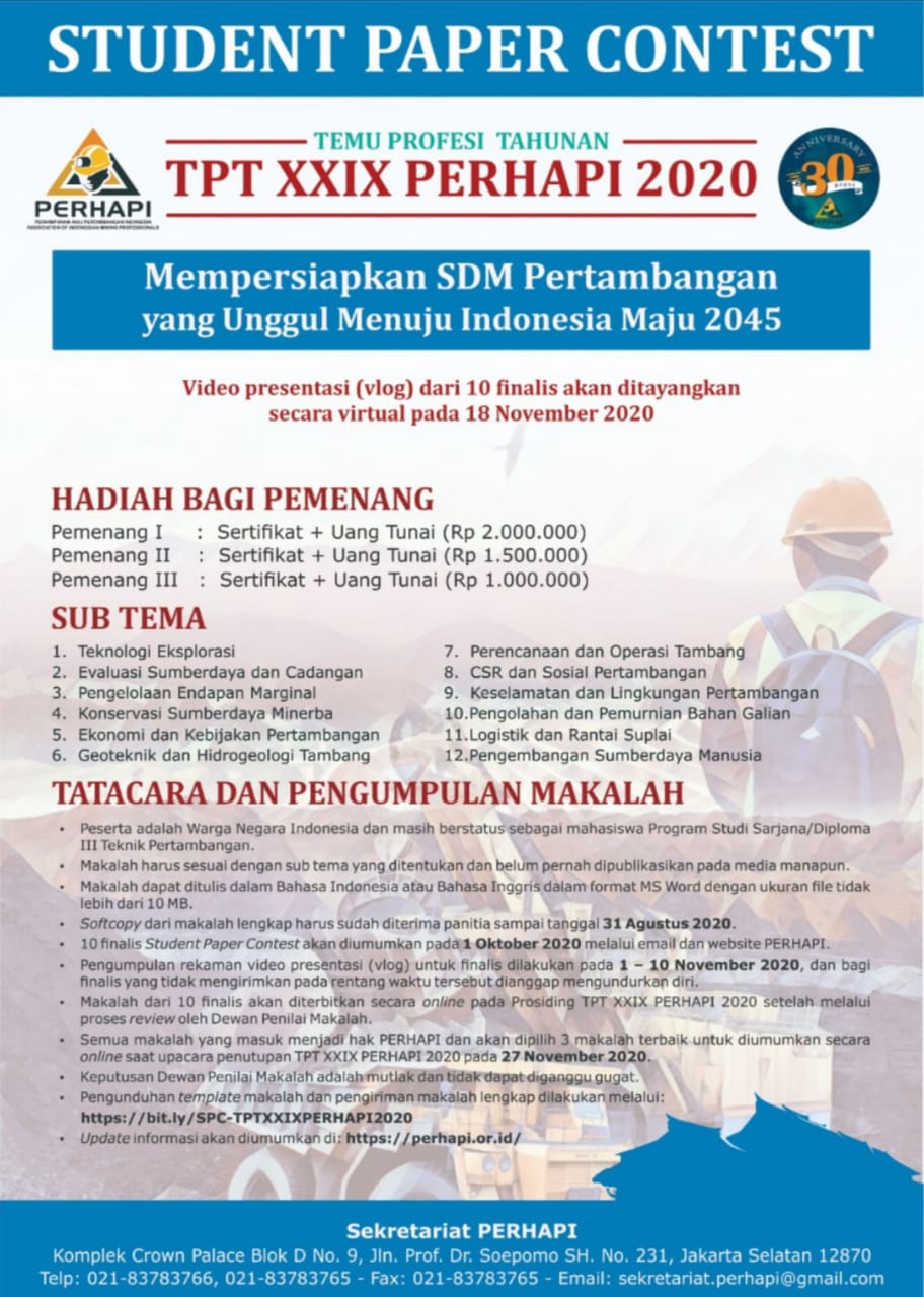 PERHAPI Mengadakan SPC dalam rangka Temu Profesi Tahunan (TPT) XXIX 2020 dengan tema: Mempersiapkan SDM Pertambangan Unggul menuju Indonesia 2045.
